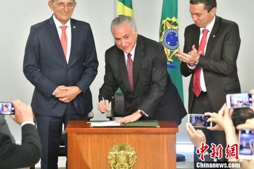 图为巴西总统特梅尔(中)在总统府签署“中国移民日”法令。 钟小新 摄