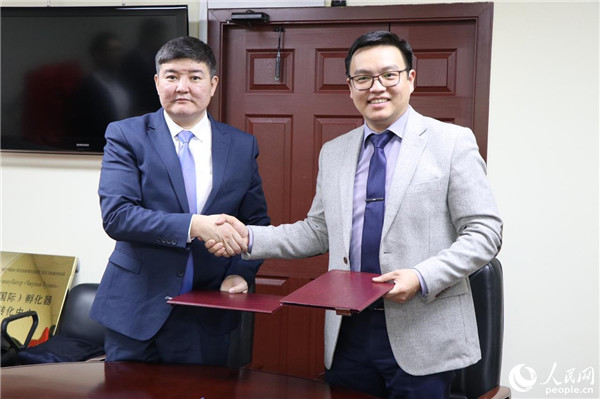 中亚互联(国际)孵化器 总经理和阿拉套创新技术园经济特区总经理在签约仪式上合影(人民网记者周翰博摄)