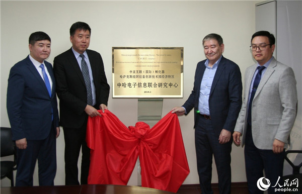 与会嘉宾共同为中哈电子信息联合研究中心揭牌(人民网记者周翰博摄)