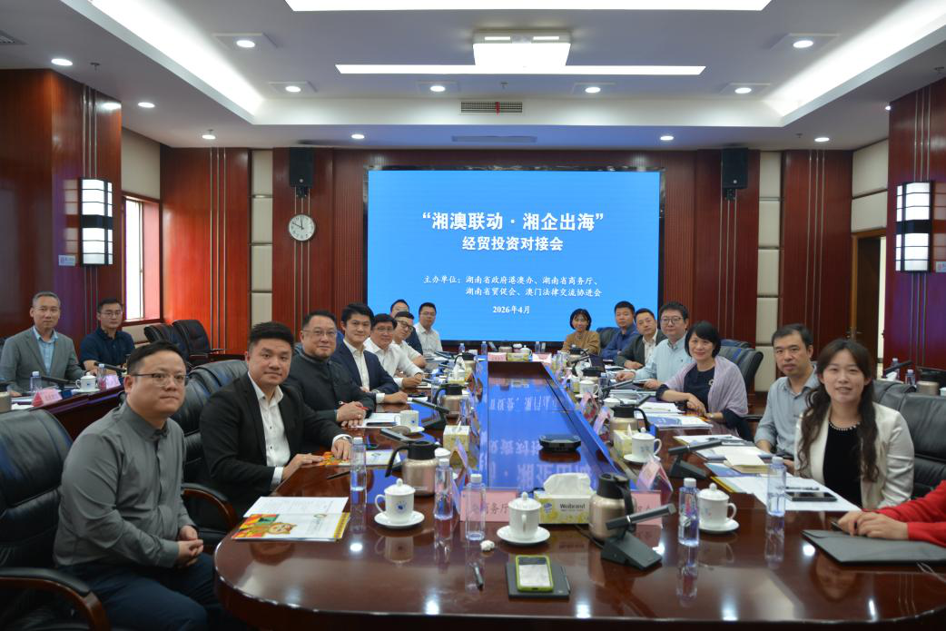 4月9日,“湘澳联动·湘企出海”经贸投资对接会在长沙顺利召开。湖南省政府港澳办副主任、一级巡视员郭向丽主持会议,澳门法律交流协进会会长黄景禧率澳门代表团出席,省商务厅、省贸促会及湘江新区相关负责人参会交流,10余家意向出海葡语、西语国家的湖南企业现场推介产品和对接资源。