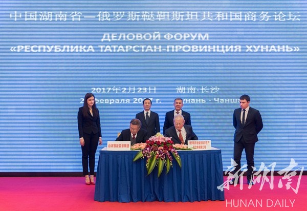 2月23日,省委副书记、省长许达哲出席中国湖南省-俄罗斯联邦鞑靼斯坦共和国商务论坛并致辞。图为签约仪式现场。湖南日报记者 赵持 摄