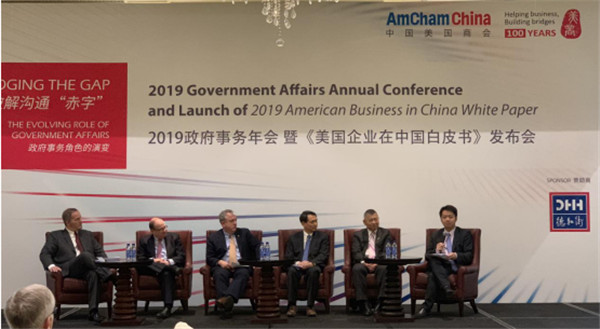 人民网讯 4月18日,中国美国商会(AmCham China)举办“2019年政府事务年会暨《美国企业在中国白皮书》发布会”。中国人民大学重阳金融研究院执行院长王文受邀参加,并作为特邀嘉宾在白皮书发布环节参与了专题研讨。