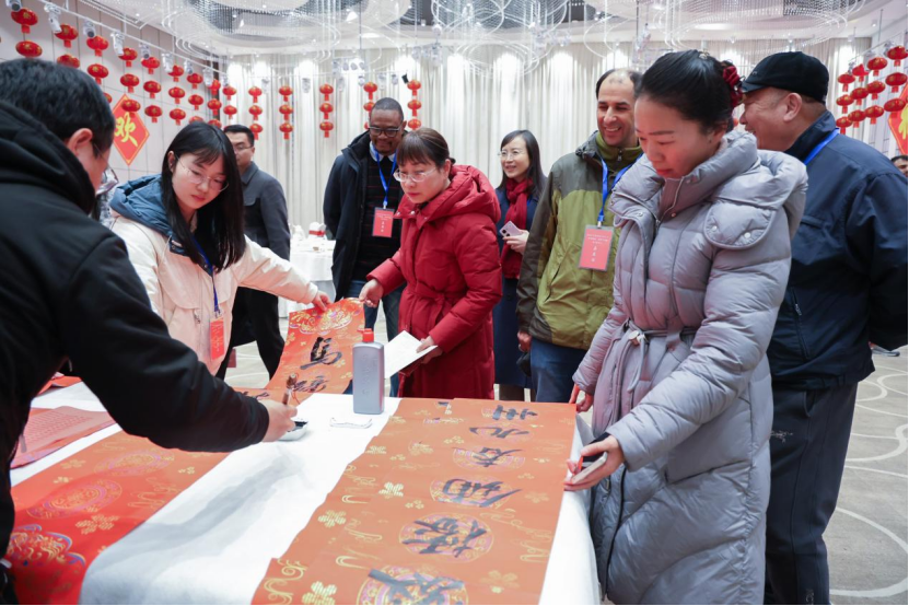 会场悬挂灯笼、同心结与传统雨伞,洋溢着新春喜庆氛围。书法家现场书写春联,吸引众多中外友人驻足挑选。