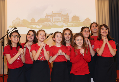 ▲二〇一九年二月八日,在意大利拉齐奥的古镇蒂沃利,蒂沃利国立住读学校的学生们在中国春节庆祝活动上给大家拜年。