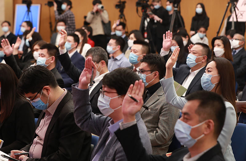 3月7日,十三届全国人大五次会议在北京人民大会堂举行视频记者会,国务委员兼外交部长王毅就中国外交政策和对外关系回答中外记者提问。这是记者在梅地亚中心多功能厅举手提问。新华社记者 卢烨 摄