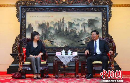 14日晚间,湖南省副省长何报翔(右)会见香港特区政府驻外经贸办代表团团长黎蕙明一行。 罗心锦 摄