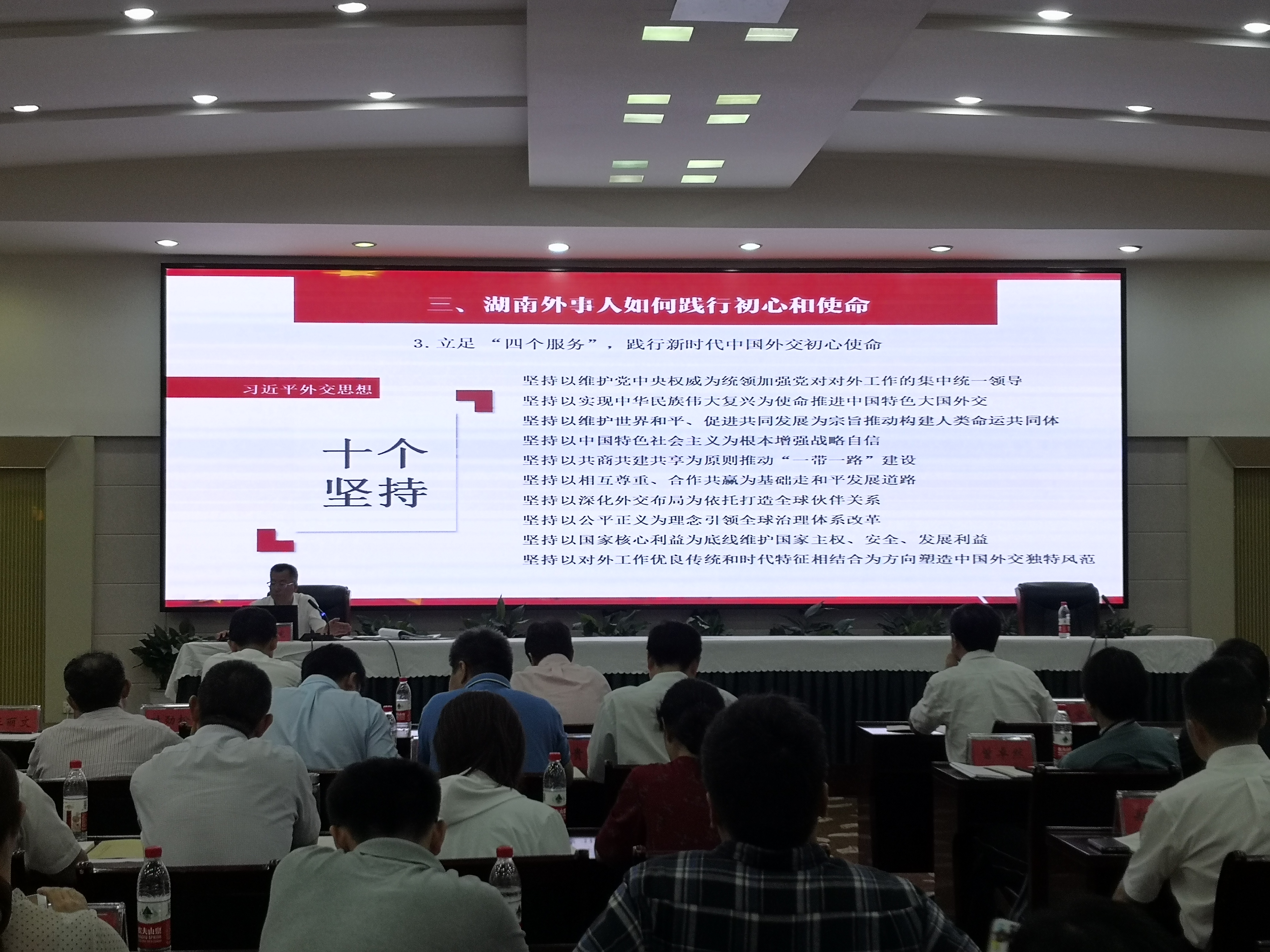 读书班期间,徐正宪主任作了关于“外事人的初心和使命”的主题党课,着重结合我省外事工作实际,对湖南外事工作者如何践行新时代中国外交初心和使命进行了分析探讨。省委党校中共党史研究部主任霍修勇教授从党的奋斗历程为学员们深入解读了中国共产党的初心和使命,启发全办党员干部在中国共产党辉煌历史的激励下,为人民幸福、为民族复兴而不懈奋斗。中国问题研究院美国研究所所长滕建群教授结合当前国际热点事件,分析了大国战略背景下的中美关系,为我省外事系统进一步把握国际形势、做好地方外事工作进行了一次深刻的形势政策教育。