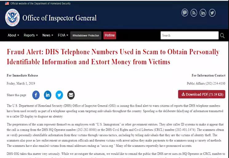 据中国驻纽约总领馆网站信息,近年来,美东地区电信诈骗高发频发,不少中国侨胞上当受骗。引诱侨胞中招的大多为冒充中国使领馆、国内公检法机关的使用“中文定制”的诈骗电话,但实际上“英语”电信诈骗在美国也很常见。美国国土安全部近日发布警告,提醒民众注意防范假冒该部、移民局等政府机构名义套取个人信息或骗取钱财的电信诈骗活动。