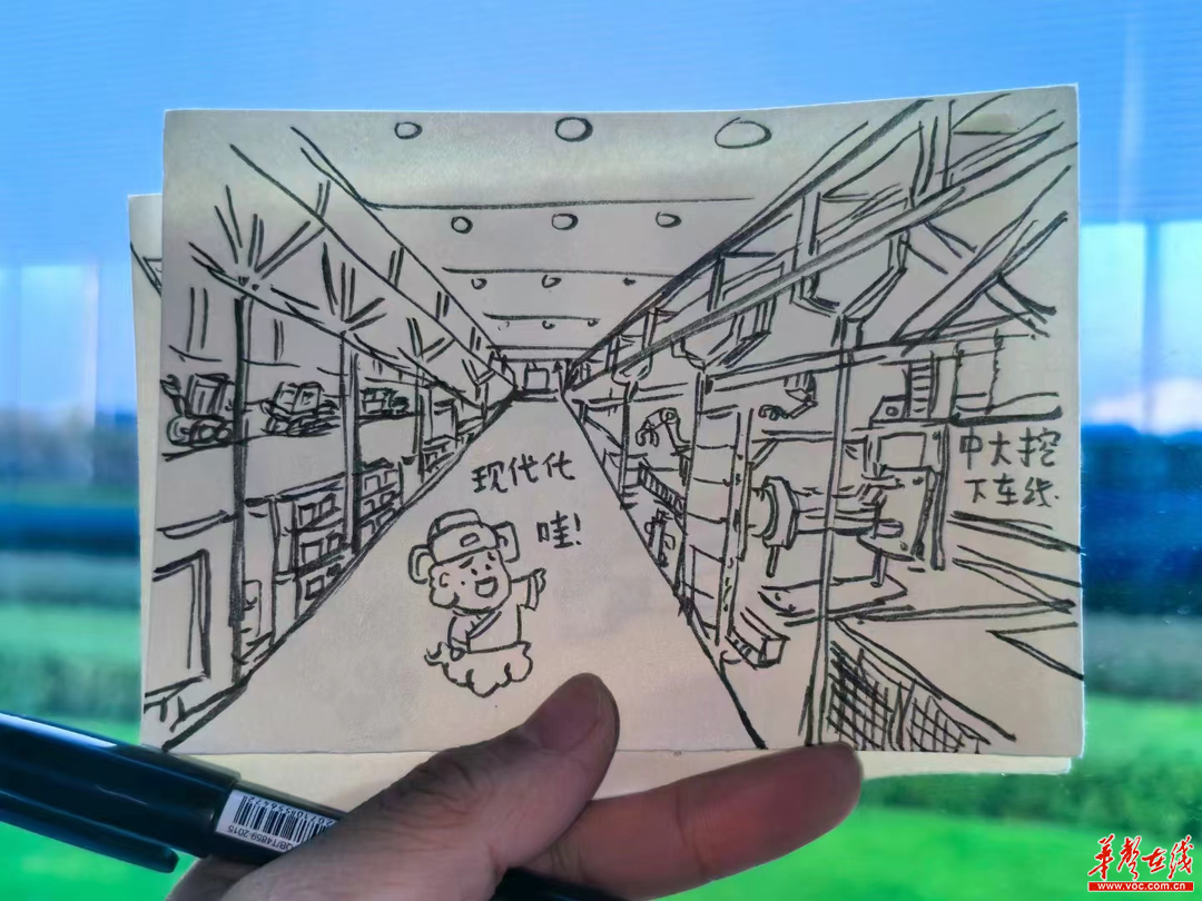 网络名人@魏泽楷不断感慨装配车间带来的震撼,立马拿出画笔,为网友展示中国制造、湖南制造的强大。