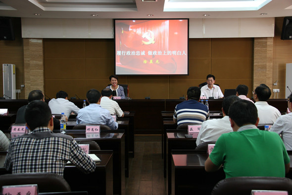 徐晨光书记首先讲述了政治忠诚的内涵和内容。他指出:“政治忠诚是指领导干部要秉持政治信仰、政治信念、政治追求、政治信心、政治信任,以忠心耿耿、全心全意的态度对待党和人民赋予自己的工作职责。要忠诚于党,忠诚于国家、忠诚于人民。”接着,他从“当前面临的新情况、新问题、新挑战,党内存在不适应、不符合的问题,党肩负的历史使命等三方面阐述了党员干部履行政治忠诚的意义。最后对共产党员对党绝对忠诚的具体要求进行了着重论述:一要全心全意地对待自己献身的组织;二要尽心尽力地对待自己从事的事业,三要中正方直地对待自己的理想,四要言而有信地对待自己的承诺。