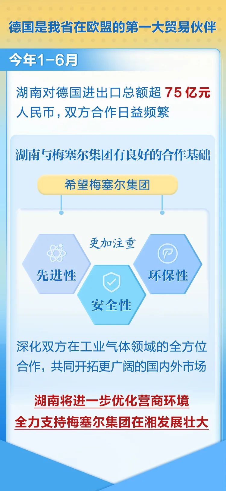 德国是我省在欧盟的第一大贸易伙伴,今年1-6月,湖南对德国进出口总额超75亿元人民币,双方合作日益频繁。湖南与梅塞尔集团有良好的合作基础,希望梅塞尔集团更加注重先进性、安全性和环保性,深化双方在工业气体领域的全方位合作,共同开拓更广阔的国内外市场。湖南将进一步优化营商环境,全力支持梅塞尔集团在湘发展壮大。