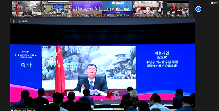 8月30日,韩国庆尚北道主办的中韩建交30周年庆典活动举行,湖南省外办徐正宪主任应邀线上出席。庆尚北道经济副知事李达姬、中国驻釜山副总领事涂敬昌,河南省、陕西省、宁夏回族自治区、吉林省代表出席活动。