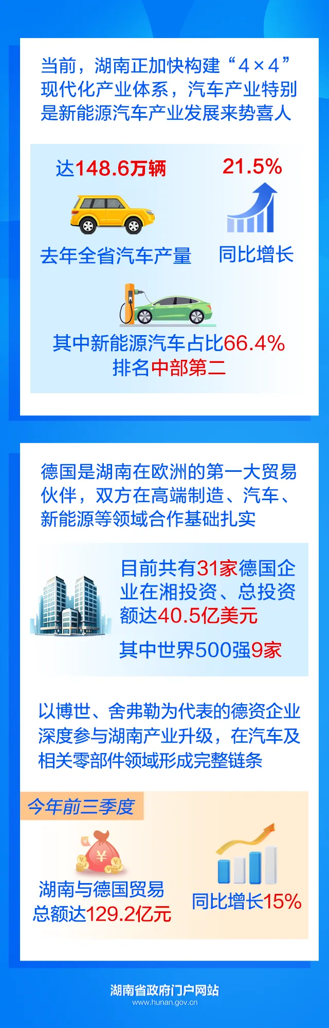 他说,当前,湖南正加快构建“4×4”现代化产业体系,汽车产业特别是新能源汽车产业发展来势喜人,去年全省汽车产量达148.6万辆,同比增长21.5%,其中新能源汽车占比66.4%,排名中部第二。德国是湖南在欧洲的第一大贸易伙伴,双方在高端制造、汽车、新能源等领域合作基础扎实,目前共有31家德国企业在湘投资、总投资额达40.5亿美元,其中世界500强9家;以博世、舍弗勒为代表的德资企业深度参与湖南产业升级,在汽车及相关零部件领域形成完整链条。今年前三季度,湖南与德国贸易总额达129.2亿元,同比增长15%。