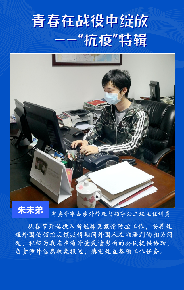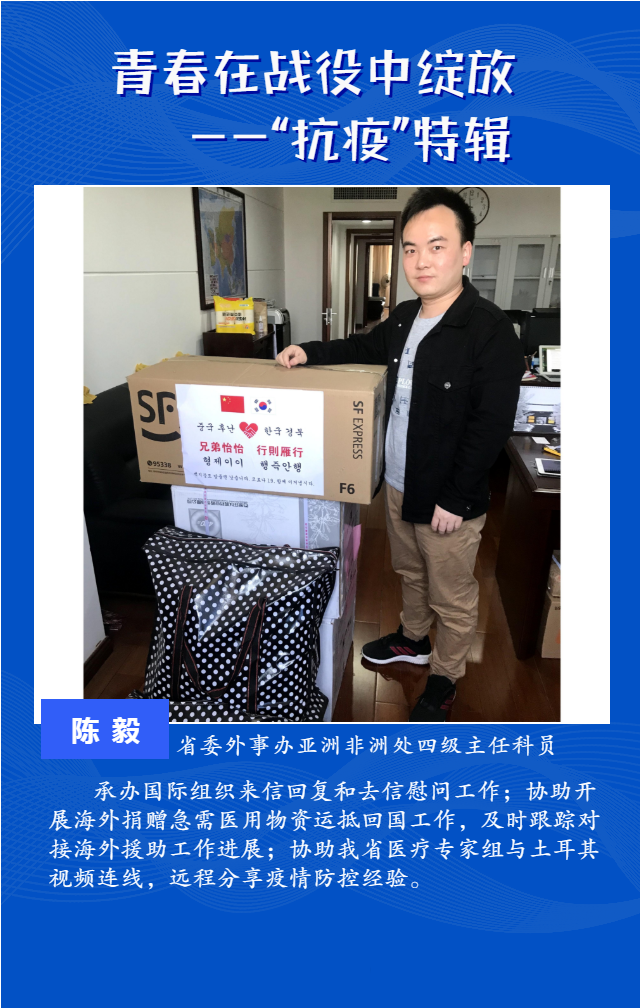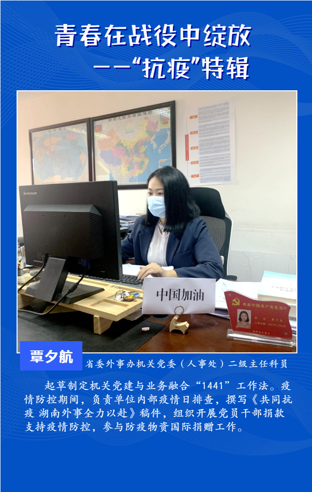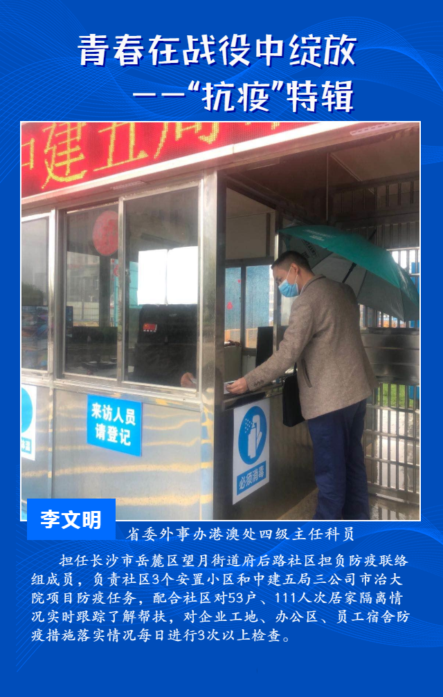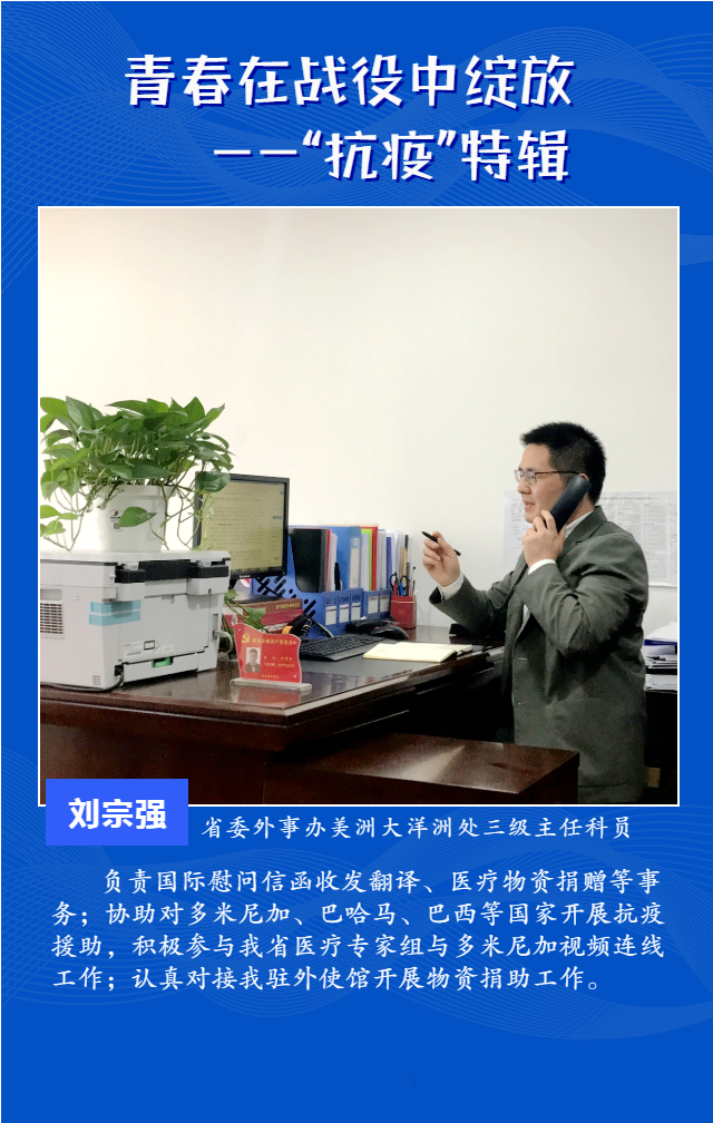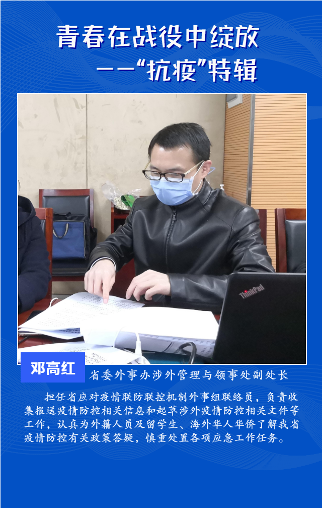编者按:鲁迅曾写道:“有一分热,发一分光,就令萤火一 般,也可以在黑暗里发一点光,不必等候炬火。”如今的我 们,正用理想和担当融入建设国家、服务社会的滚滚洪流, 用人生黄金期与“两个一百年”相拥。值此“五四”青年节 到来之际,在省直团工委号召下,我们分享外事港澳青年亲 身参与、冲锋在前的青春奋斗故事,吹响不忘初心、继续前 进的号角。无论是在疫情防控国际国内战场、扶贫攻坚战场, 还是在普通岗位,事业都因青年的坚守而精彩,感谢每一位 奋斗中的外事港澳青年“战士”!(排序不分先后)