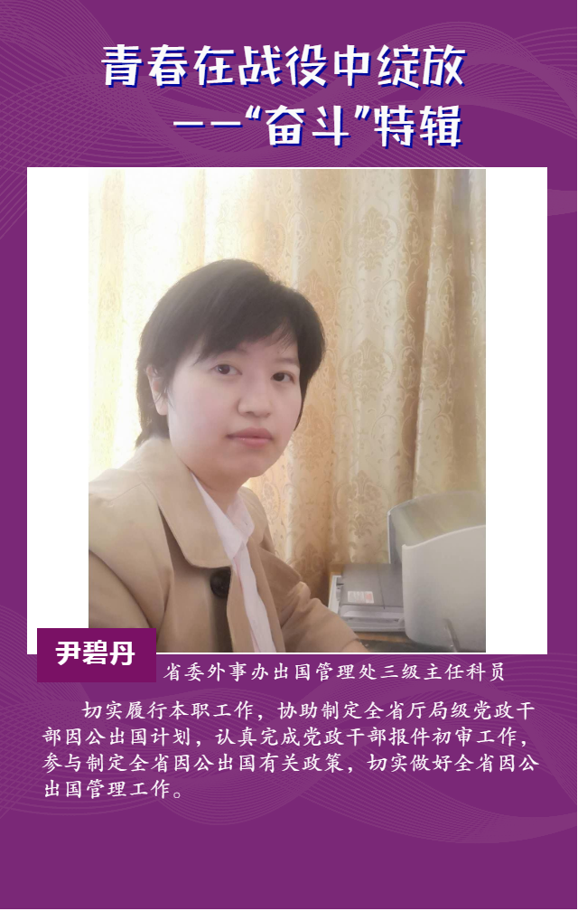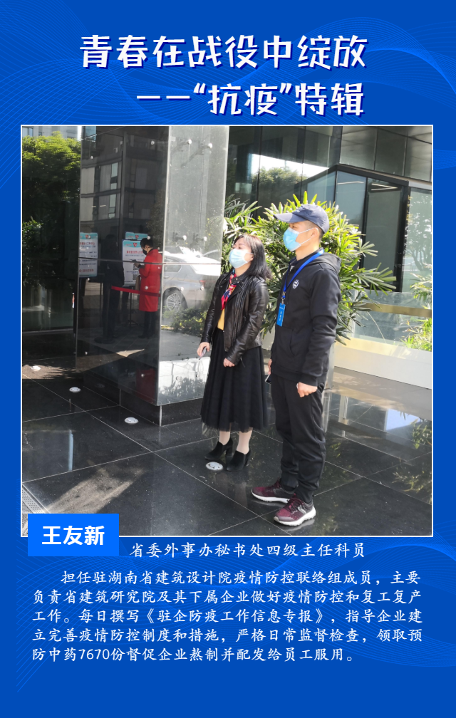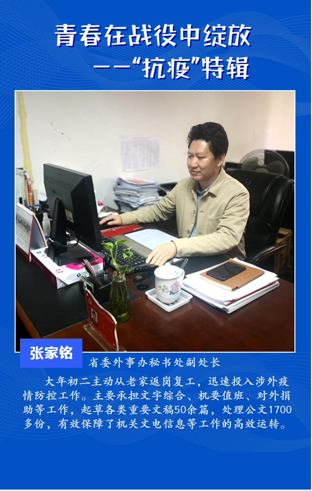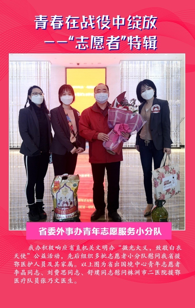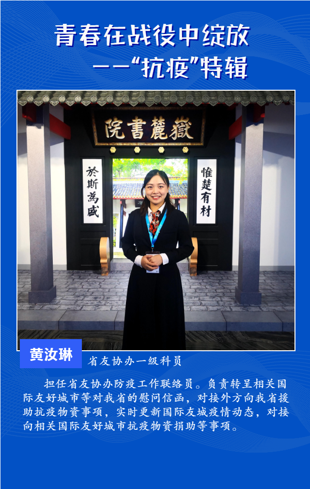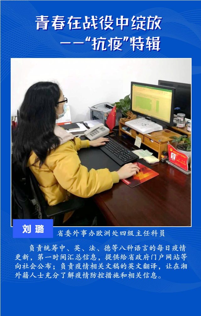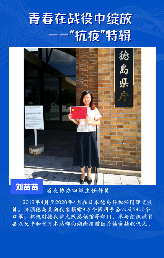 编者按:鲁迅曾写道:“有一分热,发一分光,就令萤火一 般,也可以在黑暗里发一点光,不必等候炬火。”如今的我 们,正用理想和担当融入建设国家、服务社会的滚滚洪流, 用人生黄金期与“两个一百年”相拥。值此“五四”青年节 到来之际,在省直团工委号召下,我们分享外事港澳青年亲 身参与、冲锋在前的青春奋斗故事,吹响不忘初心、继续前 进的号角。无论是在疫情防控国际国内战场、扶贫攻坚战场, 还是在普通岗位,事业都因青年的坚守而精彩,感谢每一位 奋斗中的外事港澳青年“战士”!(排序不分先后)