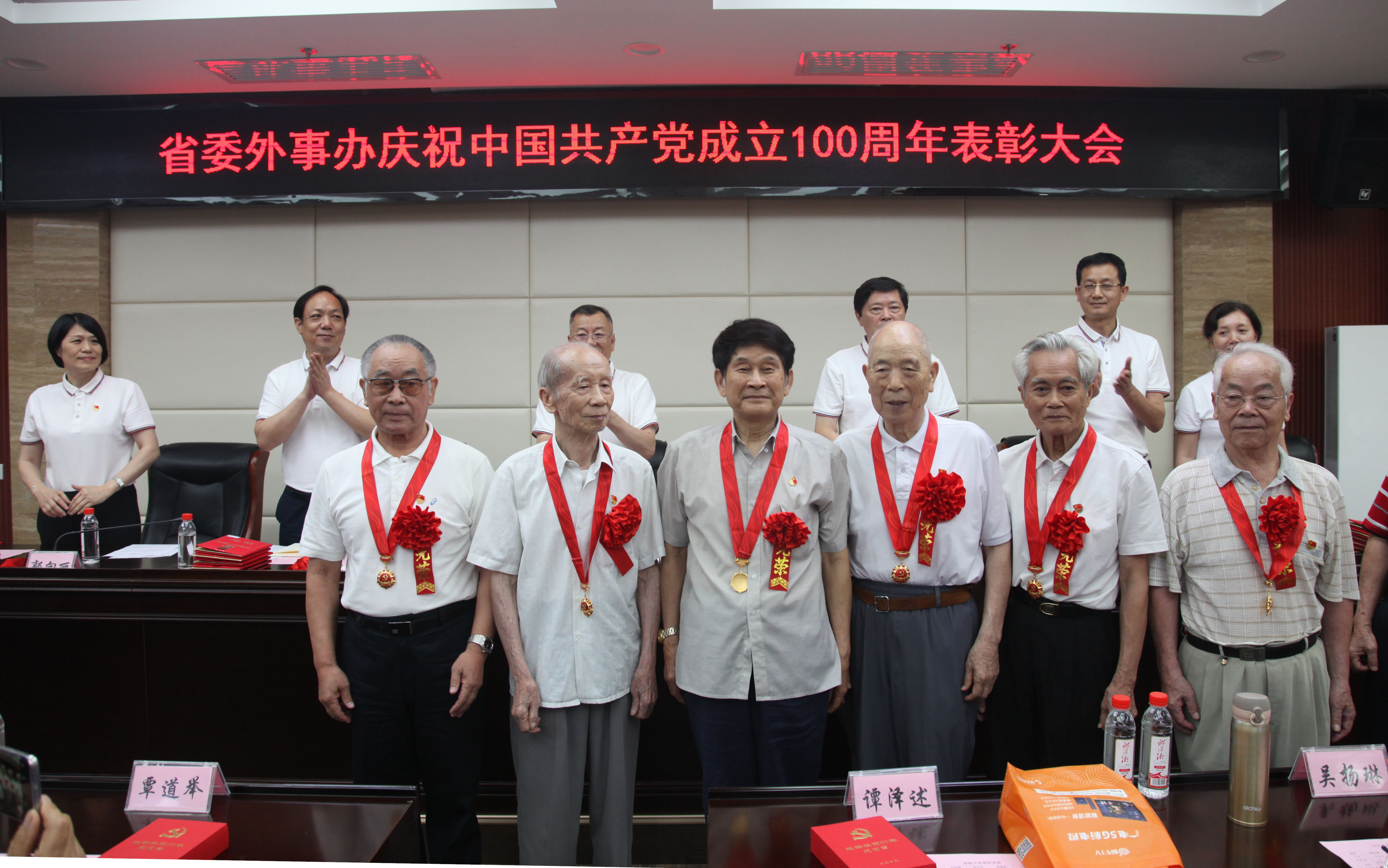 6月28日下午,省委外事办隆重举行“光荣在党50年”纪念章颁发仪式。荣获纪念章的老党员代表、省委外事办领导班子成员,机关全体干部职工,省出国(境)服务中心班子成员及党员代表参加会议。